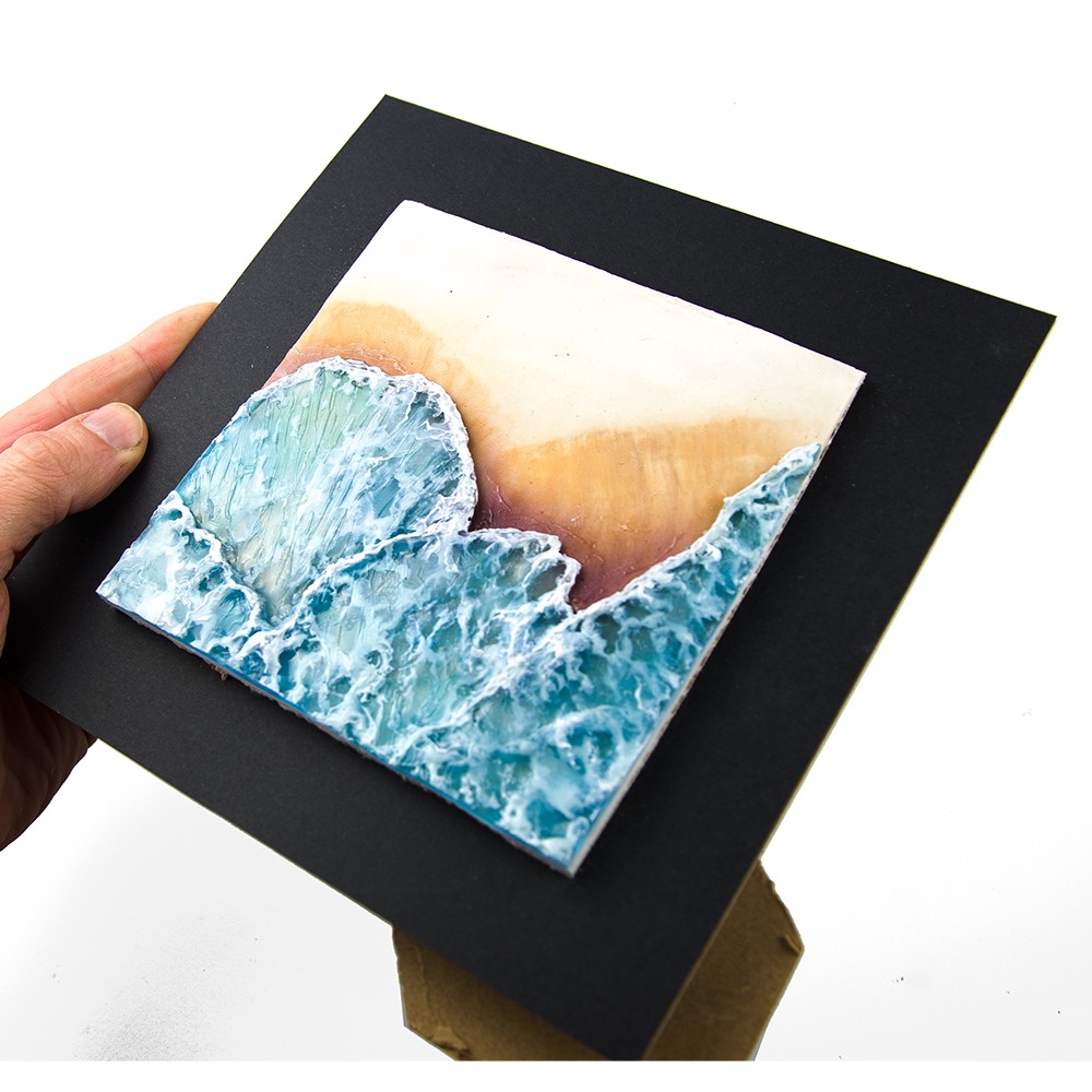 I gave out the first of that series to someone who is very dear to me and I was suddenly deprived of my first diorama, the only one with true saturated colors I did so far. As I still had the form I used for it (silicon one, reusable), I decided to do a new one while saturating the colors even more and to get a more uniform color of the sea. In order to create a nice hot-spot I also darkened the place where the two waves meet.. Well that one was sold pretty fast as well so I will be trying out a third version with yet different colors soon.